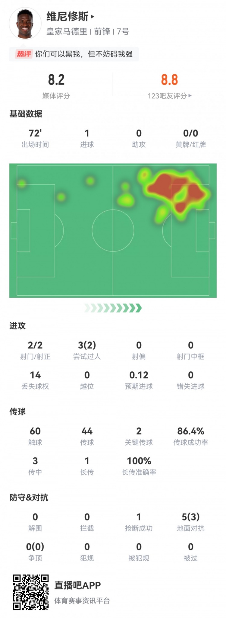 8月31日西甲第三轮战报,皇马暂时以2-1领先马洛卡。本场首发出战的维尼修斯在第72分钟被替换下场,其全场关键数据如下: