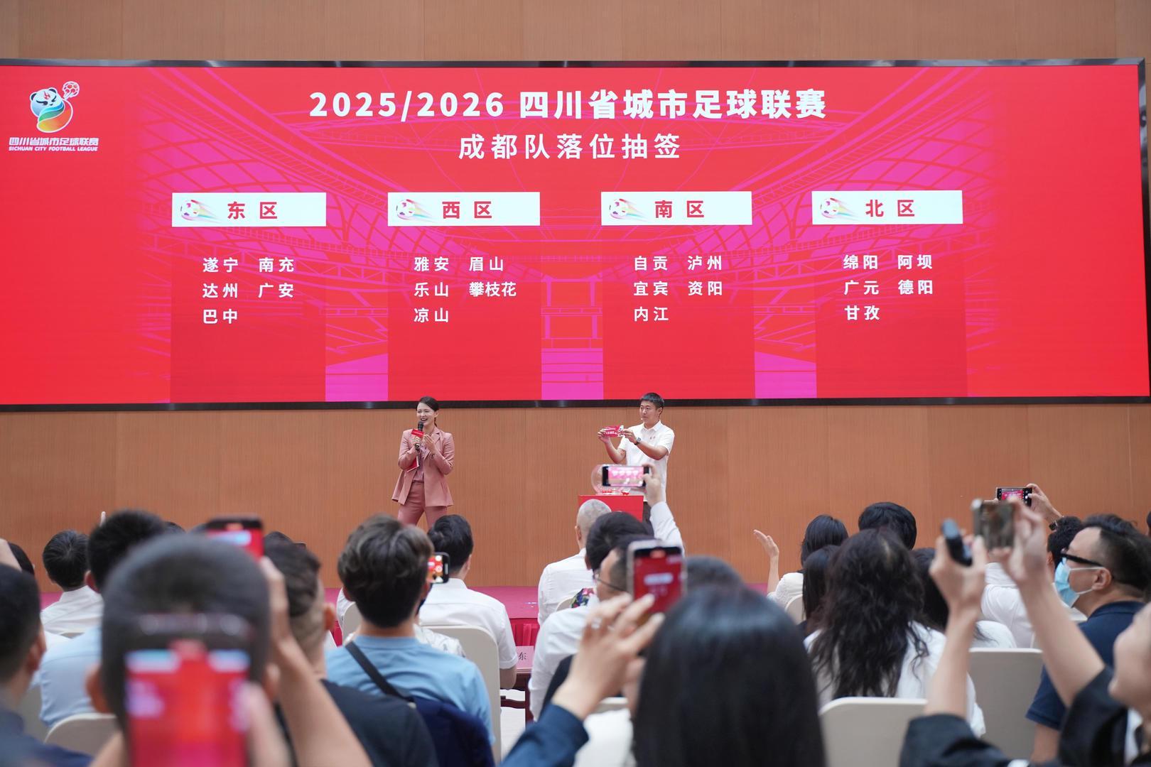 红星新闻记者在发布会现场获悉,“川超”分为东、南、西、北四个赛区。此前,成都队落位哪个赛区,备受大众关注。发布会上,成都队领队抽签落位区域,最终落位川东赛区。
