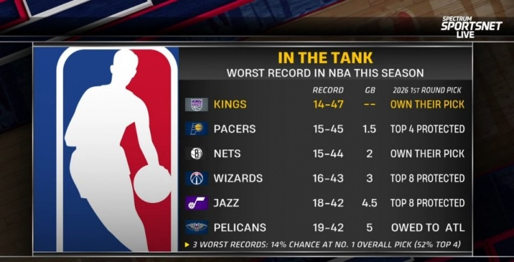 国王 14胜47负 握有自己的首轮签步行者 15胜45负 首轮签前4顺位保护篮网 15胜44负 握有自己的首轮签奇才 16胜43负 首轮签前8顺位保护爵士 18胜42负 首轮签前8顺位保护鹈鹕 19胜42负 首轮签属于老鹰倒数后三名球队抽中状元签概率均为14% 前4顺位概率52%...