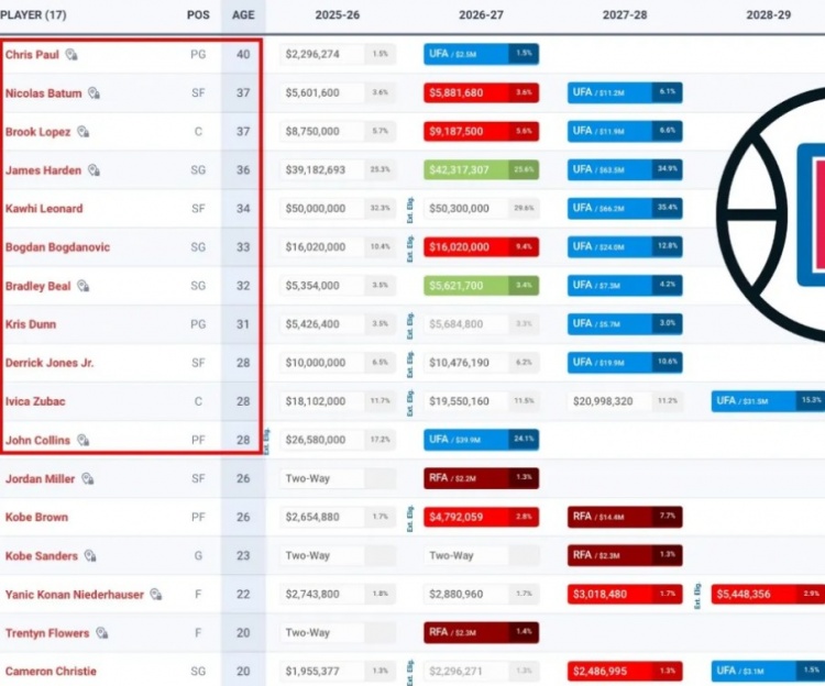 跟雷霆、步行者、凯尔特人这种核心阵容比较年轻的队伍相比,快船以高龄球员为班底,所有的力量积蓄都是为了接下来两个赛季,因为莱昂纳德的合同只剩这两个赛季。哈登和比尔虽然也剩两个赛季,但2026-27赛季可以选择不执行。